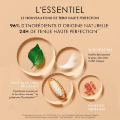 Un fond de teint avec 96% d’ingrĂ©dients d’origine naturelle*, au fini mat naturel, Ă la haute couvrance et Ă la tenue de 24H**.Â